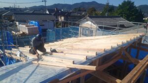 北面のタルキを打ち~大屋根の野地が完成しました。(写真は、明日UPします)