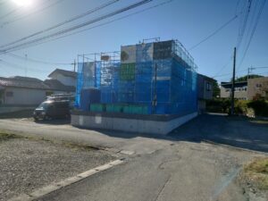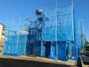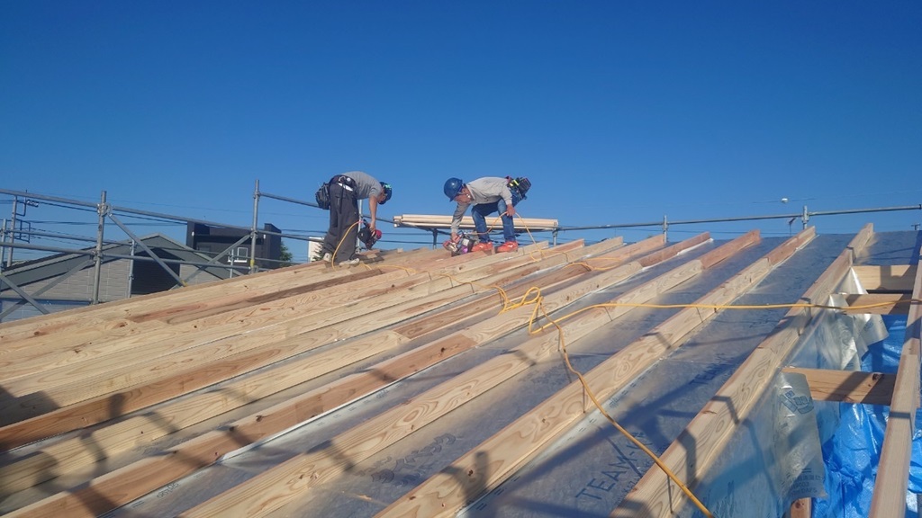 段々できてきました。遮熱シートの下側からウレタンを吹きます。そうすると、タルキの90厚が空気層となり、万が一室内からの結露した場合でも