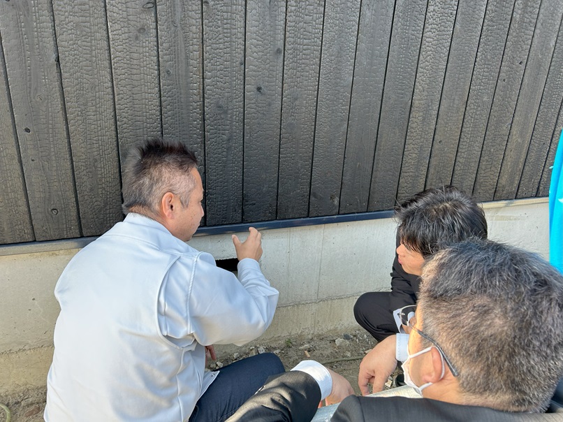 最終日は、現場見学です。この写真は、床下換気口(WB工法)の説明を平松社長がしているところです。