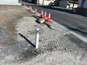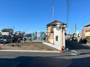 いつも地鎮祭の時には、水道、排水、仮設電気の確認をしています。 (仮設電柱は、これからたてる感じですね)
