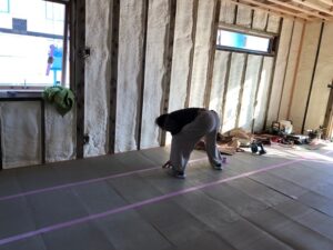 1階は、床を張り、養生板を張っています。 「かっちゃん棟梁」~「大貫大工さん」のバトンタッチしましたが