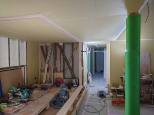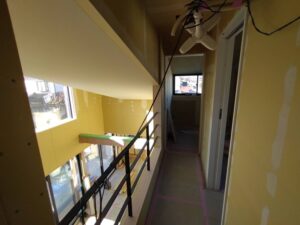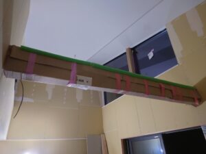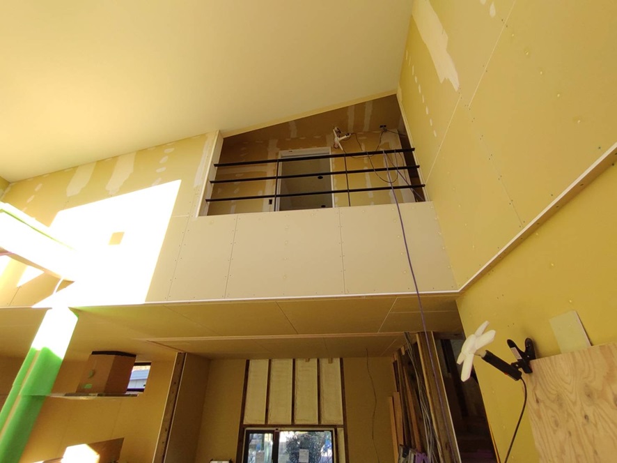 この写真のように2階の天井から仕上げ工事がはじまっています。