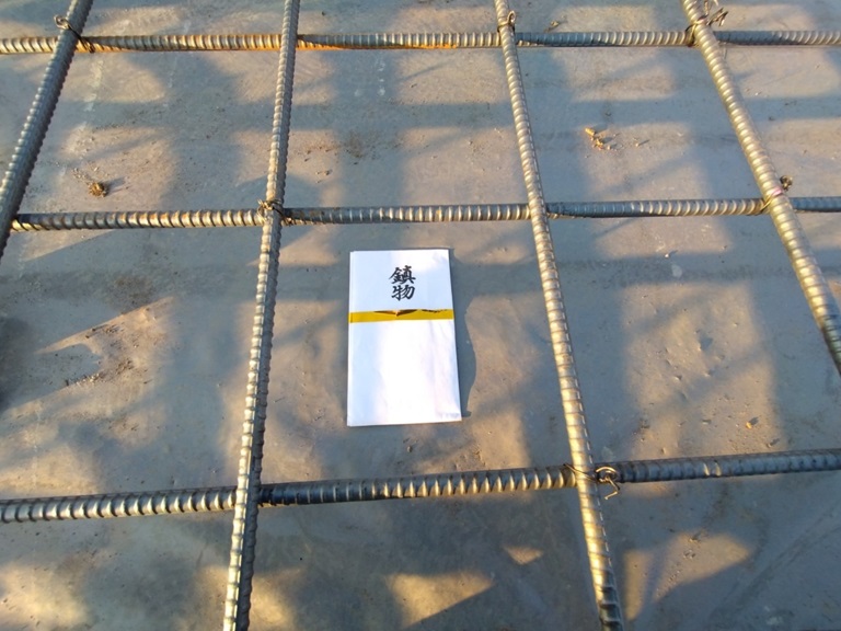 「鎮め物」も納めました。 「鎮め物」の下のシートは、「ターミダンシート」です。地下からシロアリ(その他の虫も)が寄ってこないシートを敷いています。 忌避性なので半永久的に効果が持続する優れものです。