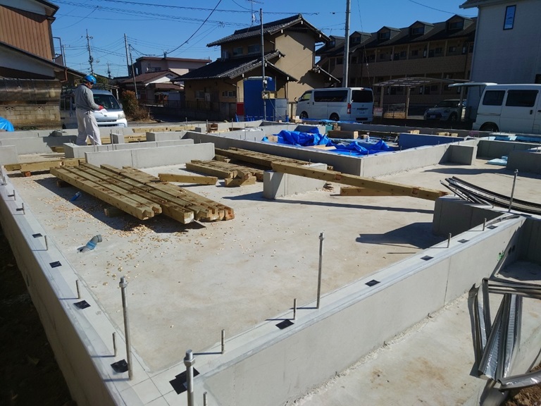 このような雰囲気で土台敷が進んでいきます。「たつみー」棟梁、「アキラー」社員大工での施工です。