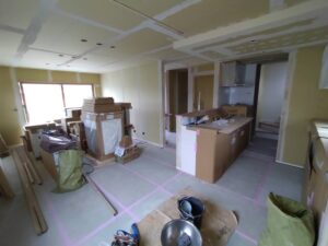 夕方は、雨になってしまいました。 2024年3月12日 最終更新日時 : 2024年3月12日 team-K風間 今日は、夕方から雨になってしまいました。 今日は、足利市のM様邸の報告をしますね 内装工事が2階から進んでいます。 2階は、天井が終わり、壁がもう少しで終わります。 1階は、キッチンは、完了! 器具も入り、内装が終わったところから(水回りから)設置していく段取りです。 外部は、デッキも完了しています。 先週の写真ですが まずは、大引きを施工。小口には、防蟻スプレーをします。 無事完成しています。 今月には、引き渡しできる内容まで進みます。(^^)/