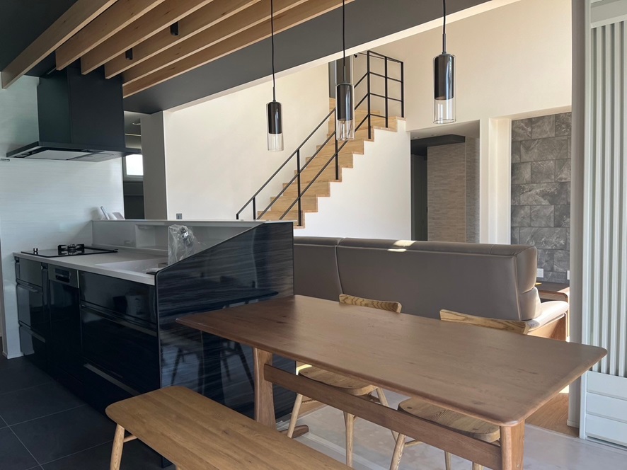 リビング~キッチン方向の写真です。 セラミック漆喰の白壁と、黒のキッチン、アイアン手すり、いい感じですね(^^♪