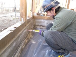 基礎の穴をあけ、ケミカルアンカーを入れます。 塚越建設監督~楽しそうですね(^^♪