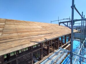 小中町のT様邸です。大屋根の瓦おろしの工事が完了しました。野地は、傷んでないので野地上から野地を貼る報告になります。