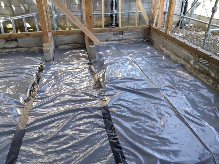 外回りをふさぐ前に基礎補強工事の段取りをしています。ターミダンシートを全面敷きます。