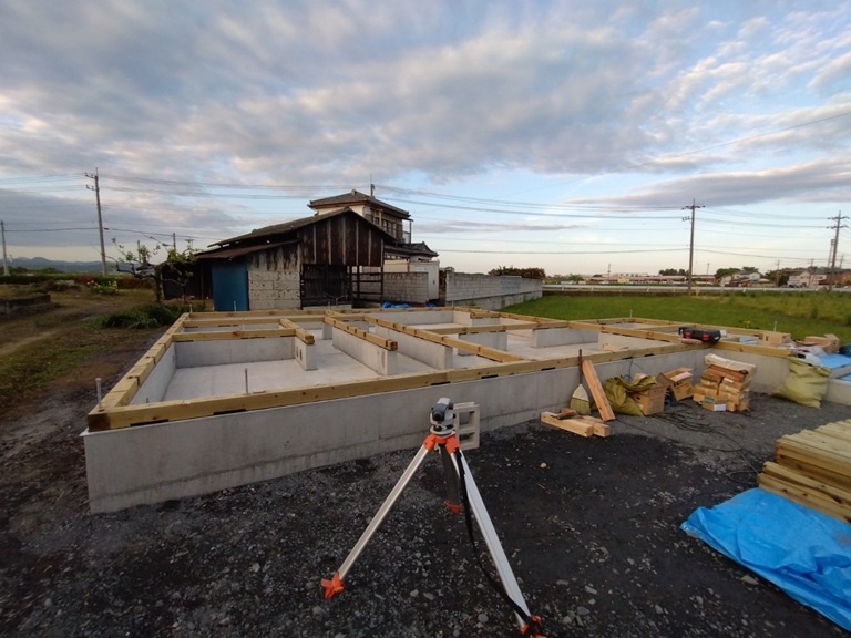 土台がほぼ施工できました。レベル確認もしています。 大引き工事が残り今日まで現場施工させてもらっています。
