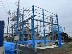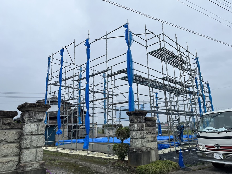 越名町のN様邸です。 昨日足場を建てました。  西から見た写真です。
