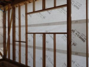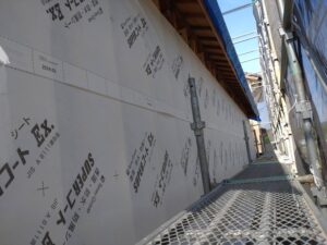 こちらは、佐野市小中町のT様邸です。 外部の通気シートが張られました。これで雨も安心ですね(^^♪