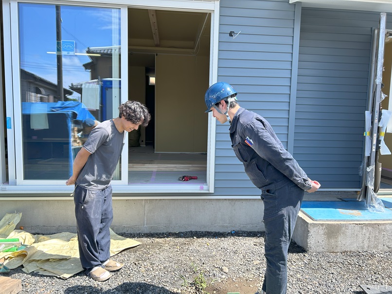 「イケメン大工カワマー」棟梁に挨拶をしてました。(挨拶は、しましたが写真は、やらせですね~姿勢が良すぎでばれますね(*´Д`))