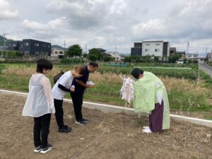 鍬入れの儀式(うがち初め)を 旦那様から「エイ、エイ、エイ!」