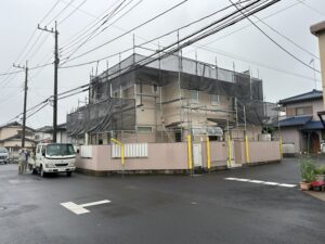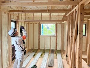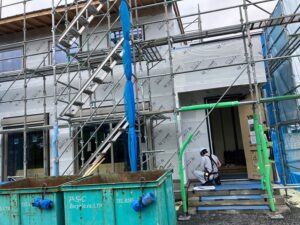 こちらは、越名町のN様邸です。 今日は、外壁下地(防水)、断熱の検査を行いました。