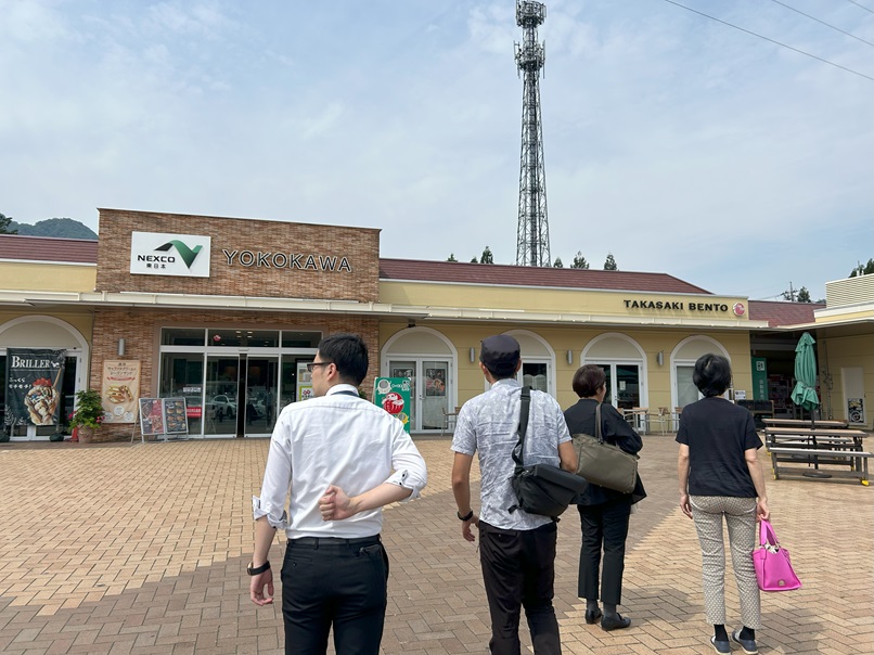 5人で参加しました。横川サービスエリアでトイレ休憩! 4人の後ろ姿! 28歳のユーキン一番貫録がありますね(^^♪