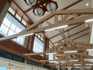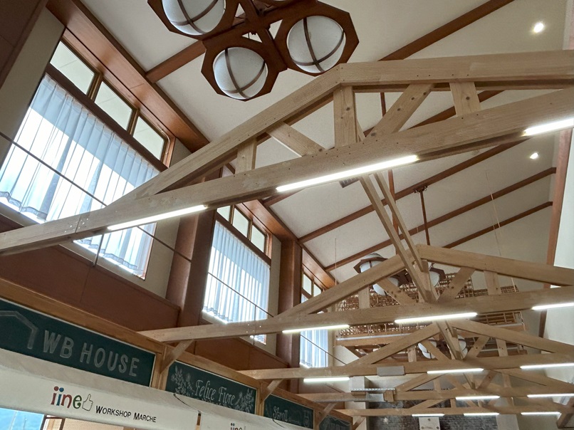 中に入ると、合掌造りのような、照明器具を付ける骨組みがm、目立ちます!
