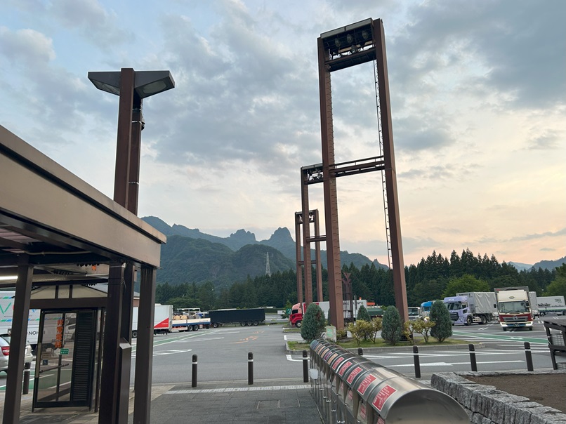 帰りも「横倉」サービスエリアで休憩、19時過ぎでも薄明るいですね~ けわしい山が見えたので写真を撮りました。(^^♪