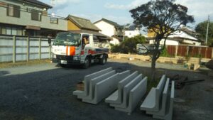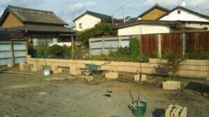 こちらは、大祝町のK様邸です。盛り土前に化粧ブロック積がはじまりました。