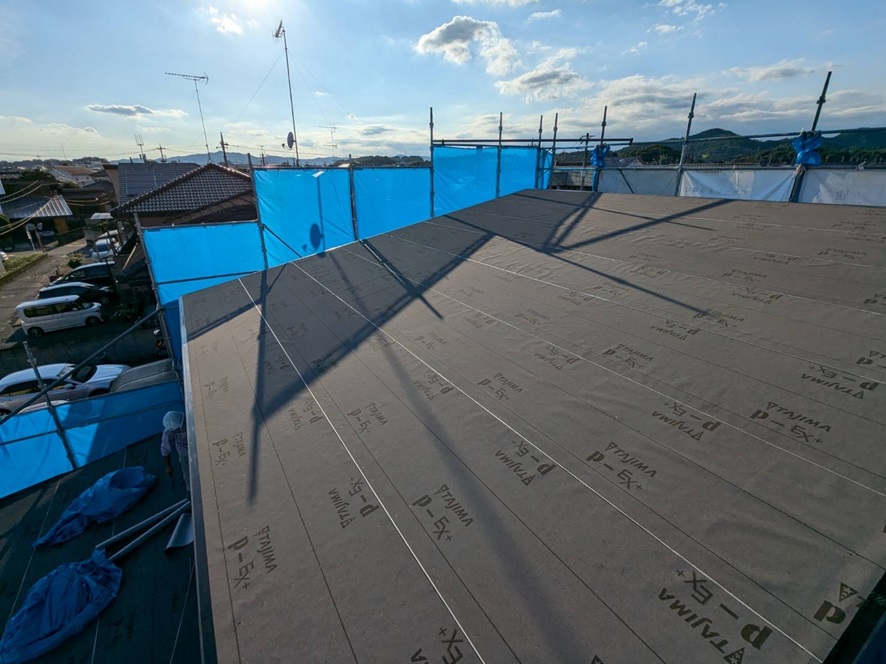 1階下屋のルーフィングまで完了しています。 順調ですね(^^♪