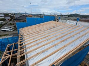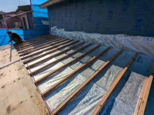 犬伏新町のH様邸です。 野地工事を行いました。まずは、3次防水になりますタイベックシルバーを敷~タルキで押さえます。
