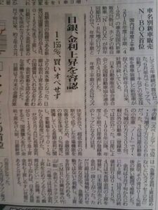 日銀、金利上昇を容認(朝刊より) 2018年10月5日 最終更新日時 : 2018年10月5日 team-K風間 住宅ローン金利に影響がありそうな内容なので、 お伝えさせていただきます。 https://mainichi.jp/articles/20181005/k00/00m/020/093000c ご参考まで。