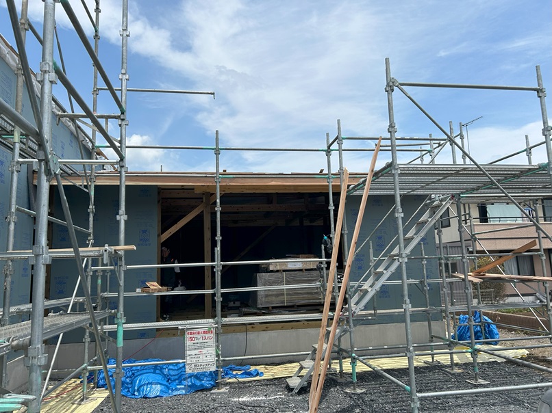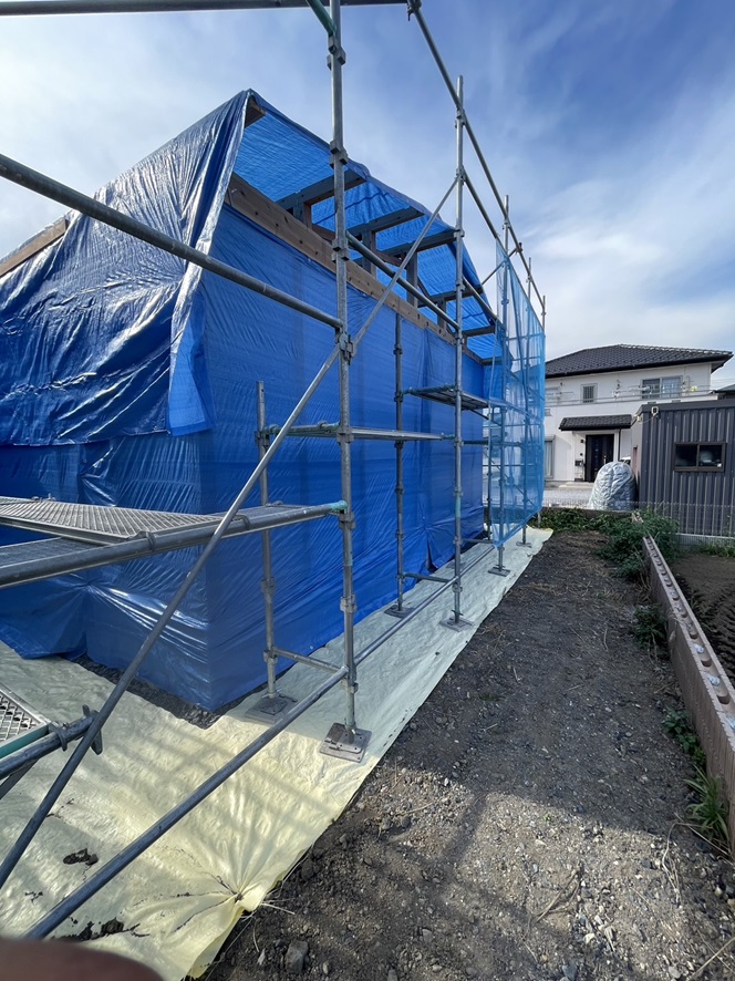 8日(月)は、建て方を行いました。最後のシート掛けまでバッチリ終わっています。