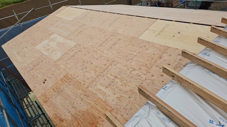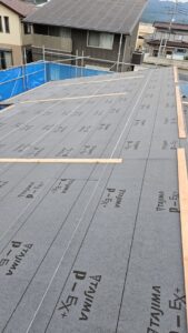 野地ができるとすぐに 改質アスファルトルーフィングを敷きます。とりあえず安心です。