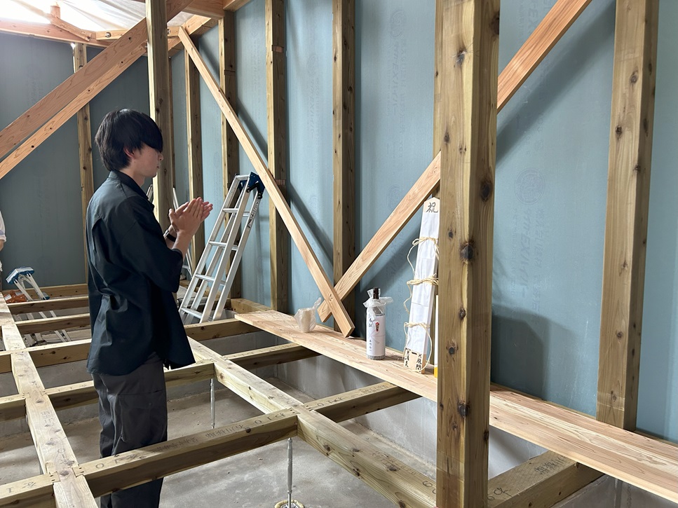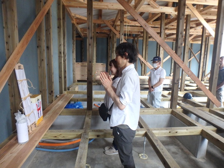 四隅を清めて頂き~室内で上棟式~「二礼、二拍手、一礼」~ありがとうございます。 ~その後全員行いました。