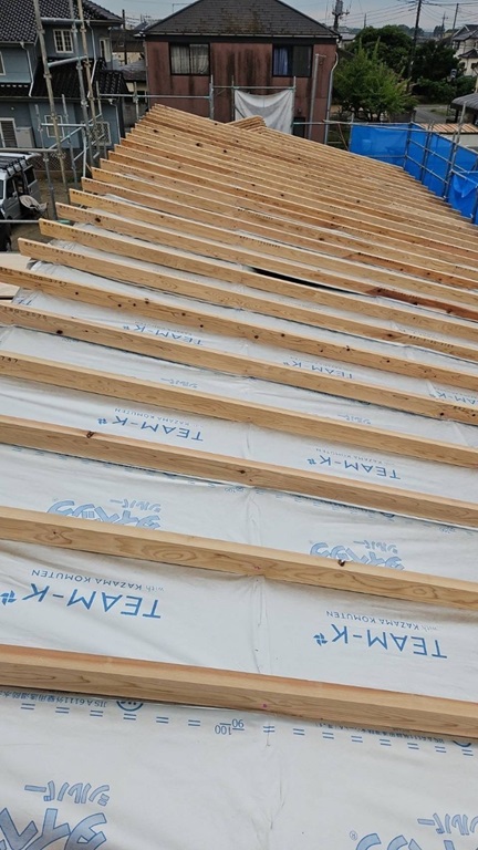 次の日からは、大工さんの出番です。 3次防水になりますタイベックシルバーを敷いて~タルキで押さえます