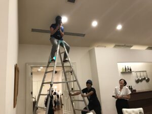受付では、スタッフと大工さんは、「タキシードTシャツ」でお出迎え!