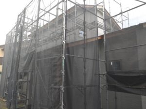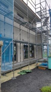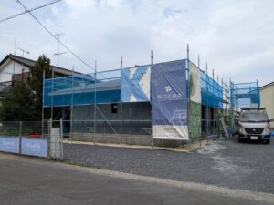 こちらは、越名町のN様邸です。外壁工事が進んでいます。 こちらは、9月に引き渡し予定です。
