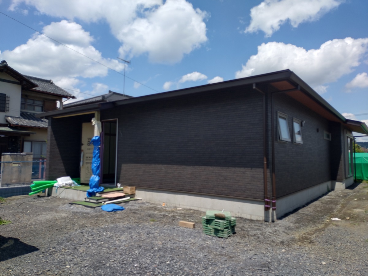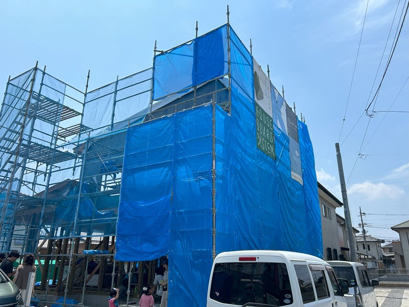 こちらは、越名町のN様邸です。外壁工事が進んでいます。 こちらは、9月に引き渡し予定です。
