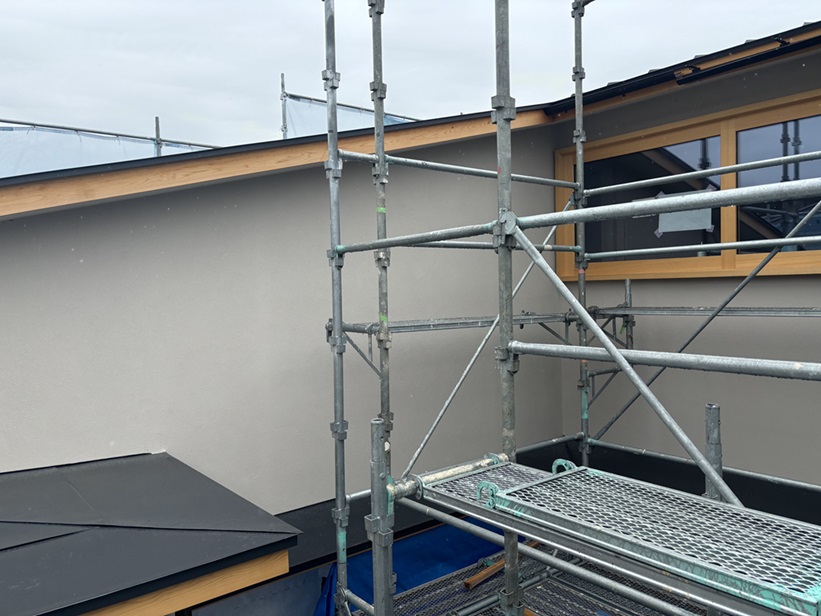 破風、木製の建具もあり足場が解体されますと良い雰囲気になりますね(^^♪(社員大工担当です)