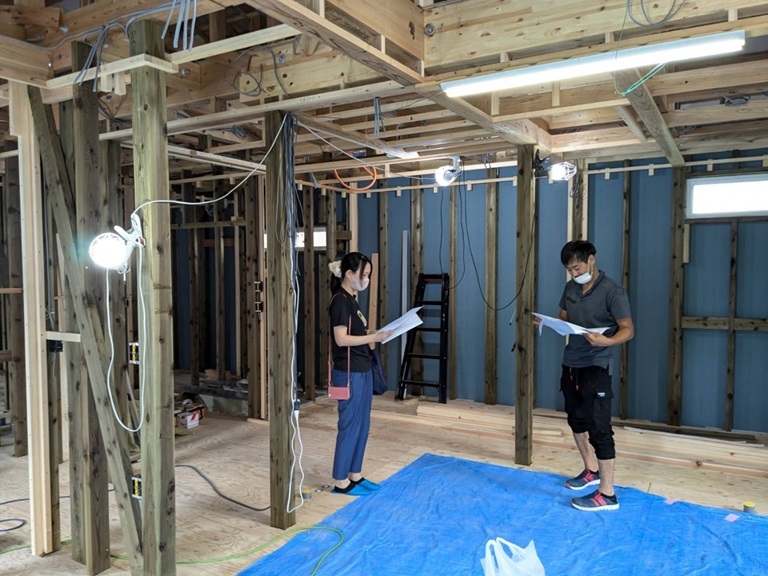 壁、天井のウレタン工事の前にお客様と「ふじまー」監督で電気配線のチェックをしている写真です。問題なく配線が配られていて