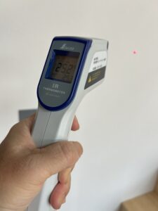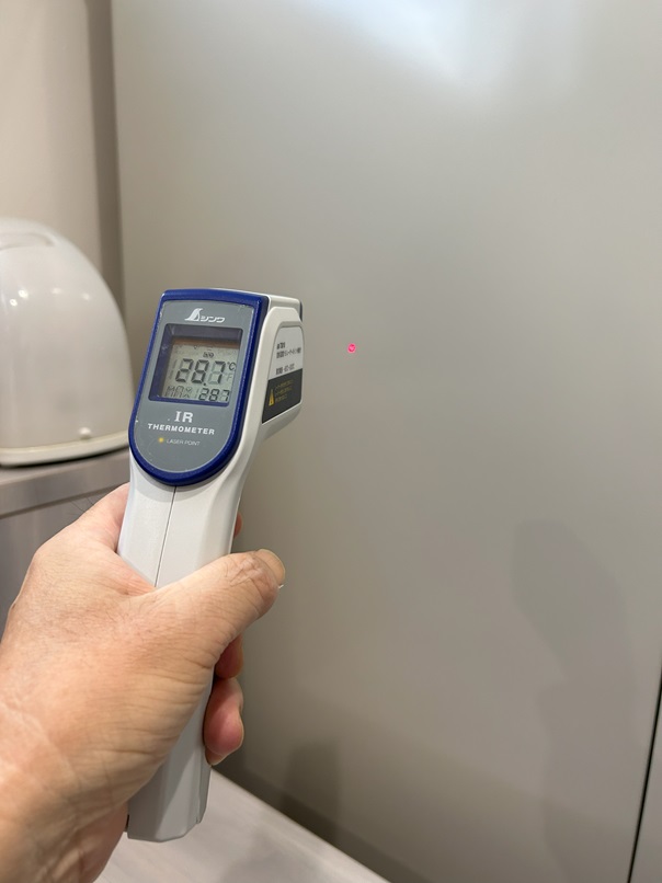 M様邸は、Fconを取りいれています。放射冷暖房は、壁の温度に下げる方式です。 写真は、25.2℃ですが24.6℃~25.2℃くらい