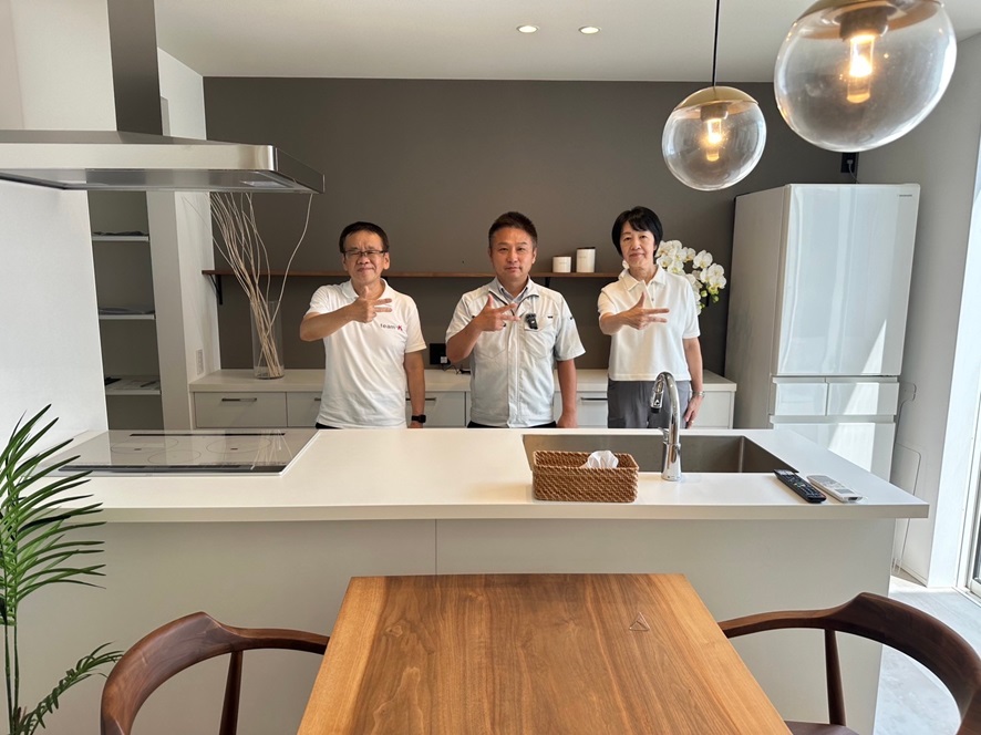 最後にM様邸での「記念写真」! 手のKポーズは、平松社長のアイデアでKポーズ決まりました!