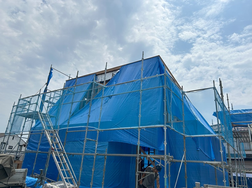 大平町のK様邸です。 大屋根の野地は、終わりブルーシートがかかった状態です。