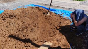 中庭に土を運ぶ作業です! 40cmくらいの厚さを入れるので量があります。