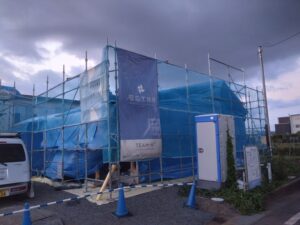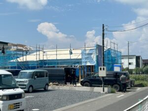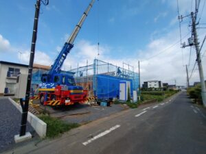 こちらは、昨日の建て方写真です。 レッカー車が入り順調に組み立てていきます。