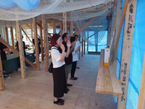 大屋根の野地合板が大体終了してお昼の上棟式を行いました。