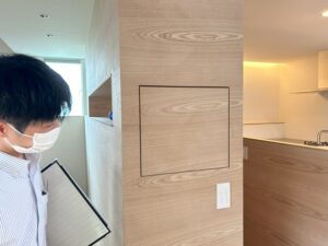 壁の□の部分に気づきいたようです! リモコン関係が中に納められています。