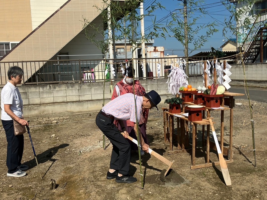 「四方払い」から起工式を行いました。 今日はじめてカメラマンでの参加「みーさん」(半田さん)頑張ってますね!