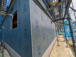 外壁の耐力壁面材も打ち終わりました。ヂュラルコートの釘で施工しています(50年、錆びがほとんどない釘です)