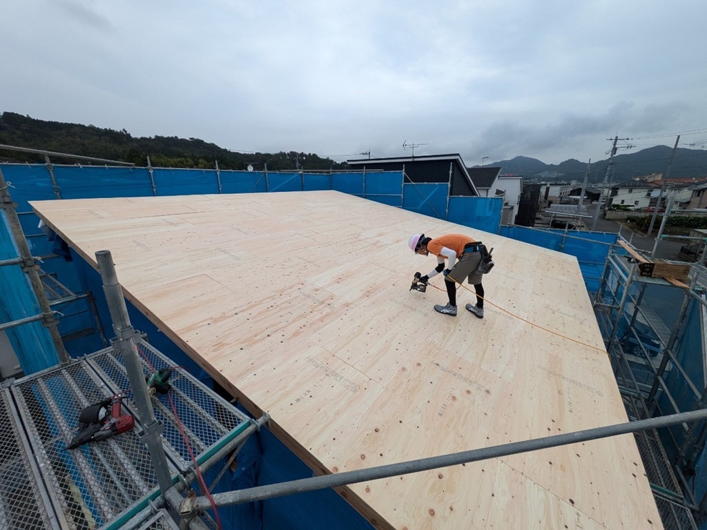 外壁の耐力壁面材も打ち終わりました。ヂュラルコートの釘で施工しています(50年、錆びがほとんどない釘です)
