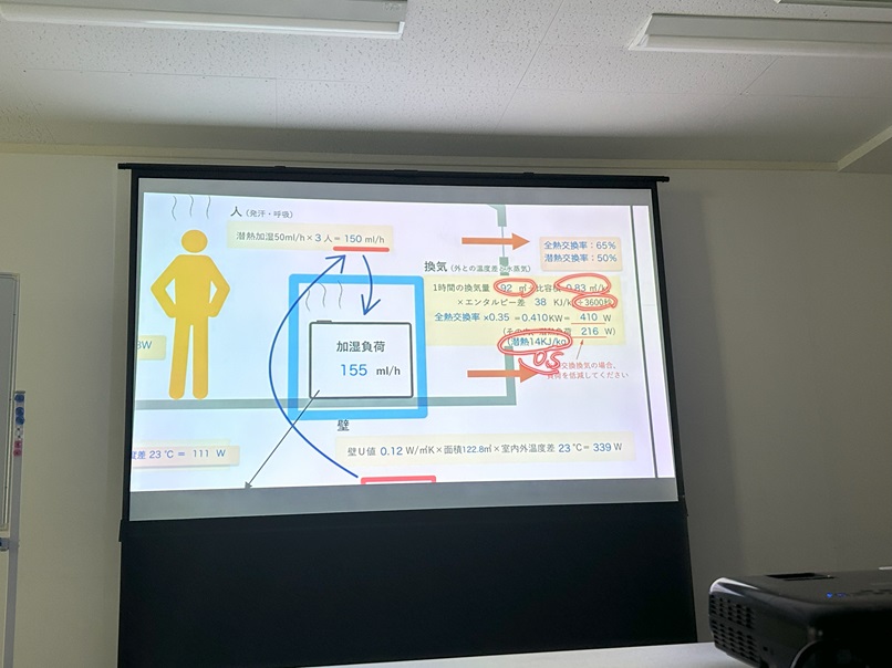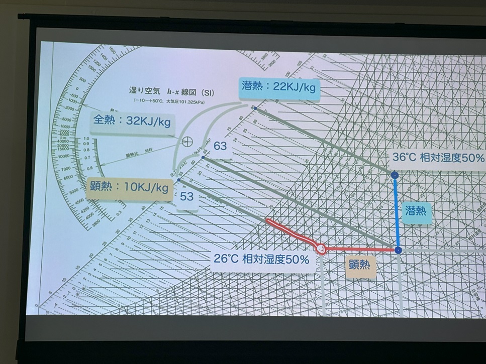 2日目は、結露の研修を1日行いました。 潜熱、顕熱の話や、 聞いたことのない「エンタルピ」も快適さの指標になるので今後は、提案