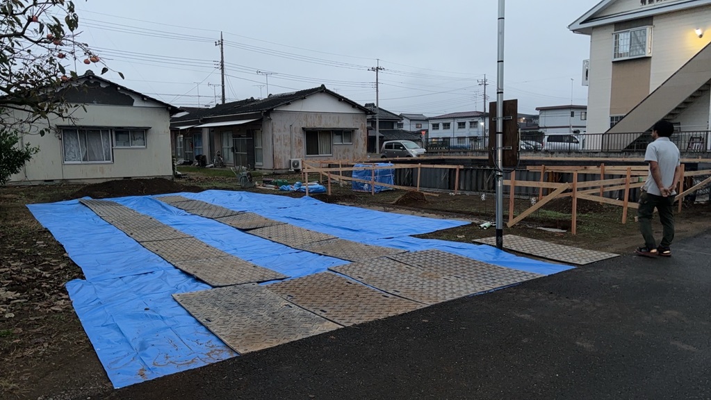 今日の現場は、足利市鹿島町のN様邸の現場です。畑の部分にブルーシート、プラシートを敷きました。達成感を感じて