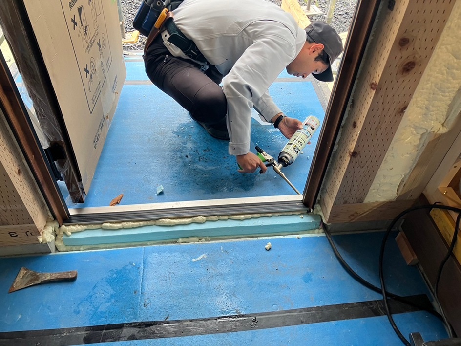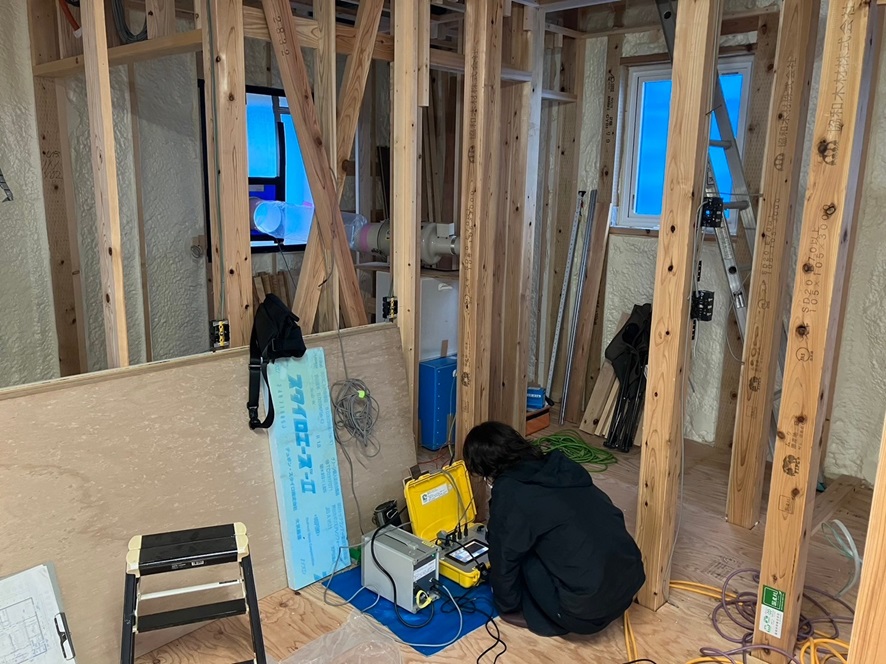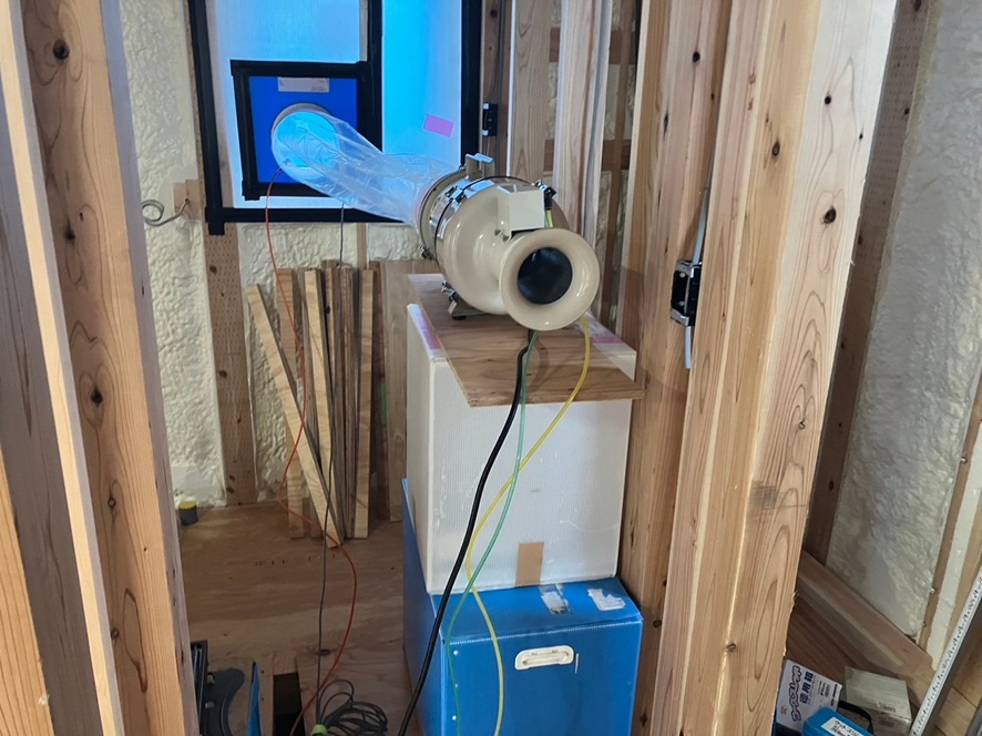 室内は、ウレタン工事が終わり、床が張られてします。気密測定の絶好のチャンスです!