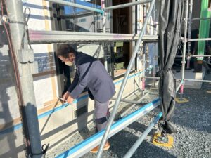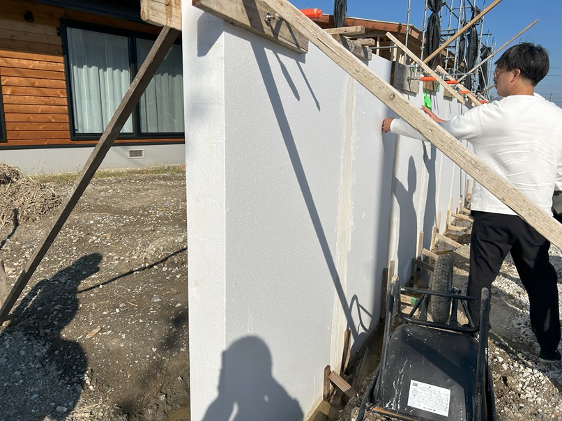 外構でEPSの壁が施工中でした。 今後このような塀も提案したいと考えてましたので勉強になりました。