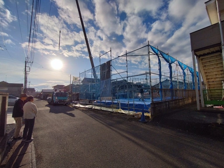 いよいよ建て方開始です。 N様ご夫婦で遠くから見ています。太陽が昇り良い景色ですね(^^♪